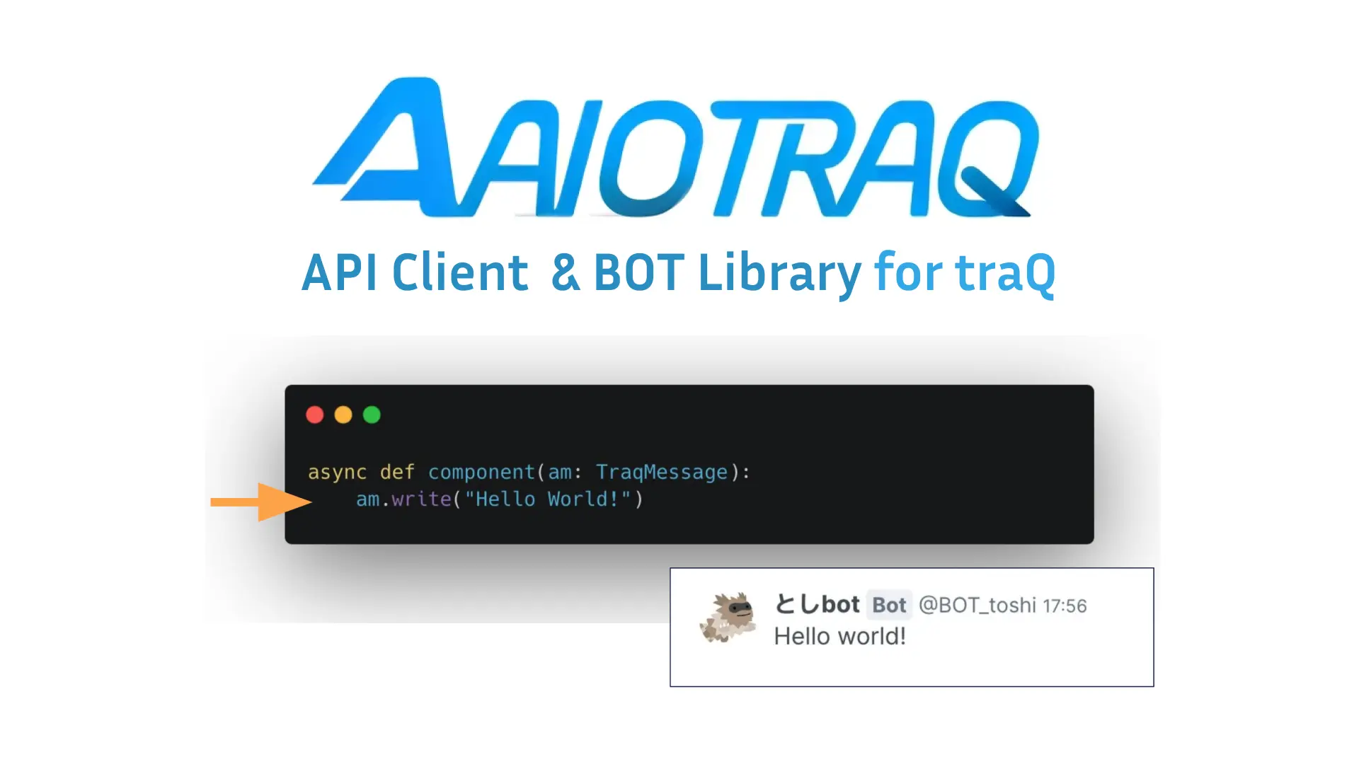 PythonでtraQ Botを高速に開発するためのライブラリです。宣言的に記述できるため、traQのAPIを意識せずにBotを開発できます